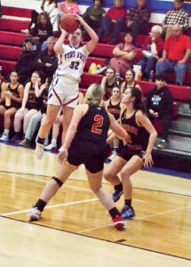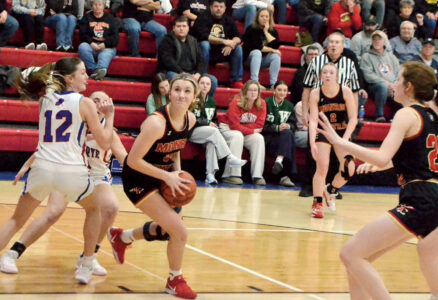 - Fort Frye’s Ella Dowler shorts a short jumper Monday night at Fort Frye High School. The Cadets lost the OVAC Semi-final 47-35 to the visiting Monroe Central Lady Seminoles. (Photo by Mike Morrison)