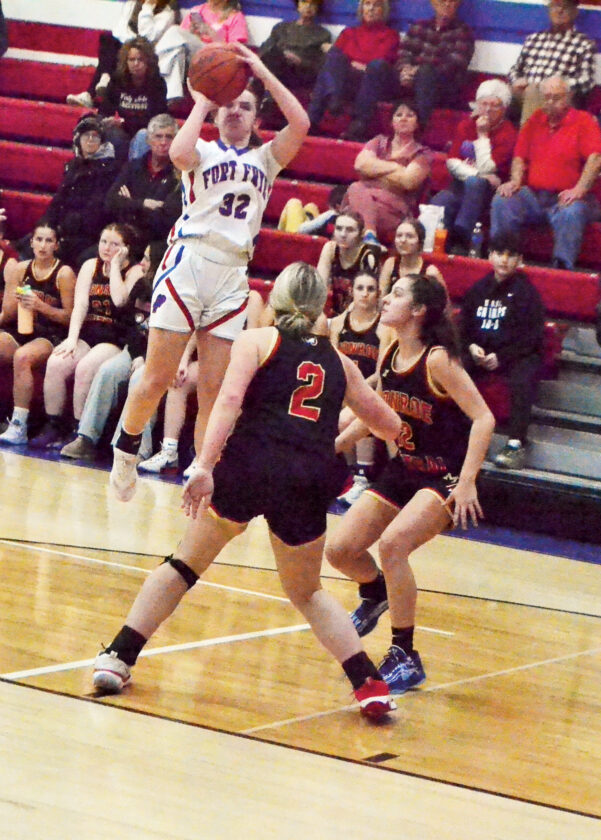 Fort Frye’s Ella Dowler shorts a short jumper Monday night at Fort Frye High School. The Cadets lost the OVAC Semi-final 47-35 to the visiting Monroe Central Lady Seminoles. (Photo by Mike Morrison)