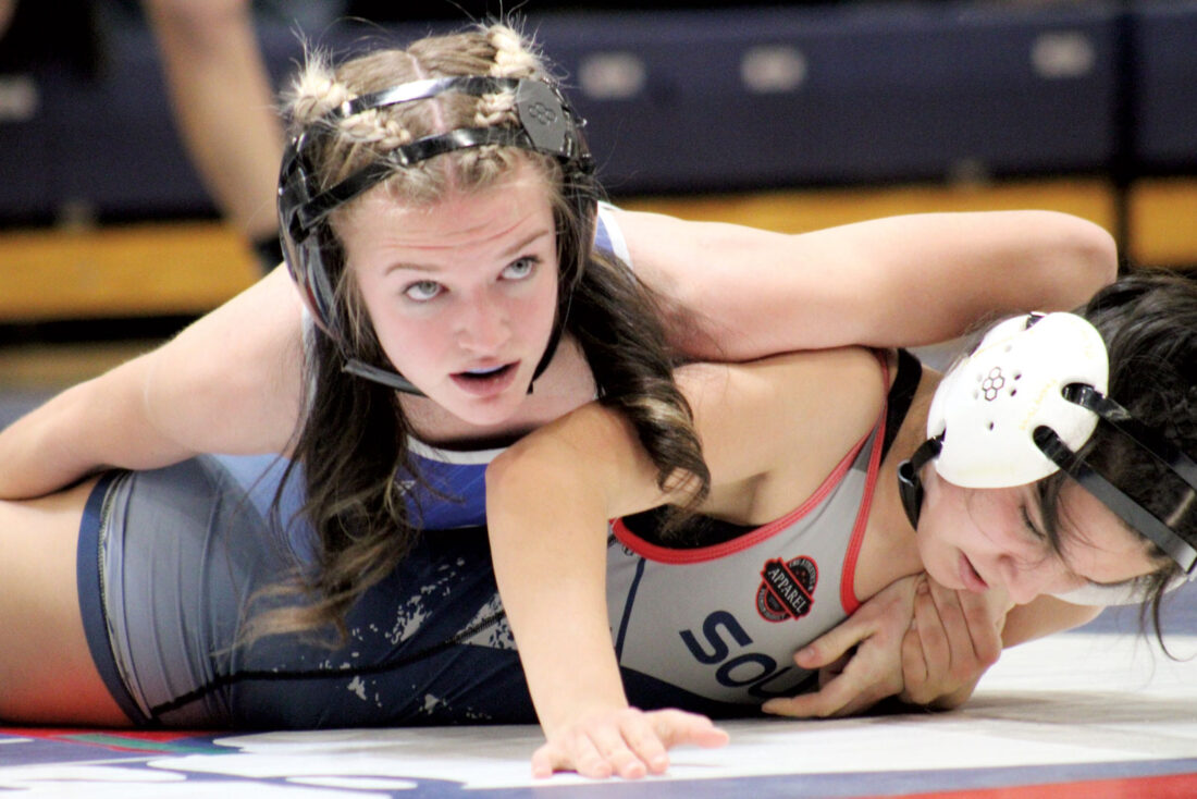 Parkersburg South’s Avery Ferguson, top, leans into Ripley’s Malazja Starcher during a girls exhibition match prior to a varsity boys wrestling meet between Parkersburg South and Ripley, Thursday at Rod Oldham Athletic Center. (Photo by Kerry Patrick)