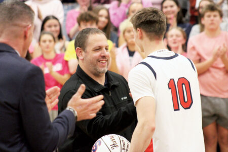 In South’s previous game against Riverside, Silvis surpassed the former mark of 1,257 points turned in during Matt Shamblin’s career as a Patriot. Shamblin also participated in the pre-game festivities and handed Silvis a basketball commemorating the achievement.