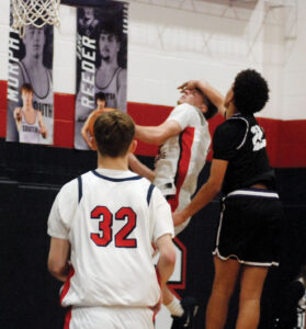- Parkersburg South’s Harry Silvis, who scored a game-high 30 points during the Patriots’ 83-64 Mountain State Athletic Conference victory versus Riverside Saturday afternoon inside Rod Oldham Athletic Center, gets hit on the way to the hole by Rocco Terry. (Photo by Jay W. Bennett)