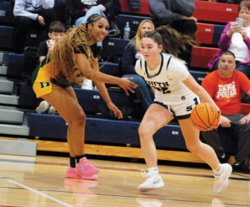 - Parkersburg South’s Quinn Bolyard uses a crossover dribble to elude the defense of Huntington’s LaLa Sloan during the Patriots’ 52-44 Mountain State Athletic Conference victory Saturday afternoon inside Rod Oldham Athletic Center. (Photo by Jay W. Bennett)