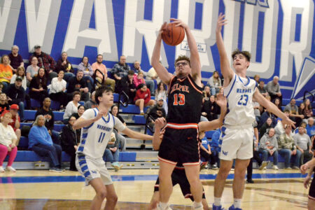 - Belpre’s Haiden Tabler (13) grabs a rebound as Warren’s Ryder Gorham (11) and Blake Grimes (23) defend during Tuesday’s game in Vincent. (Photo by Mike Morrison)