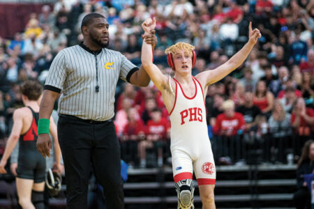 PHS 138-pound junior Stephen Myers kept his quest to become a four-time state champion on schedule thanks to his 150th career victory against Bridgeport’s Tyler Mason, who allowed a takedown five seconds into the final.