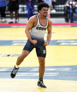 - Parkersburg South’s Jesse Adams celebrates after winning the 190-pound state championship Saturday in Huntington. (Photo by Ben Powell)