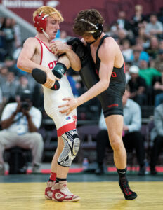 - Parkersburg’s Aiden Linko competes against Cabell Midland’s Bryson Simmons in the state wrestling finals Saturday in Huntington. (Photo by Ben Powell)
