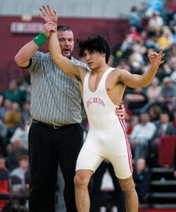 Dominic Way became a two-time state champion for the red and white when the 157-pounder took care of University’s Max Vitale by sticking him in 3:08. The Hawk gave up a takedown 25 ticks in and trailed 6-1 at 1:11 of the first as the junior Way pushed in front 9-2 after one before finishing in style.