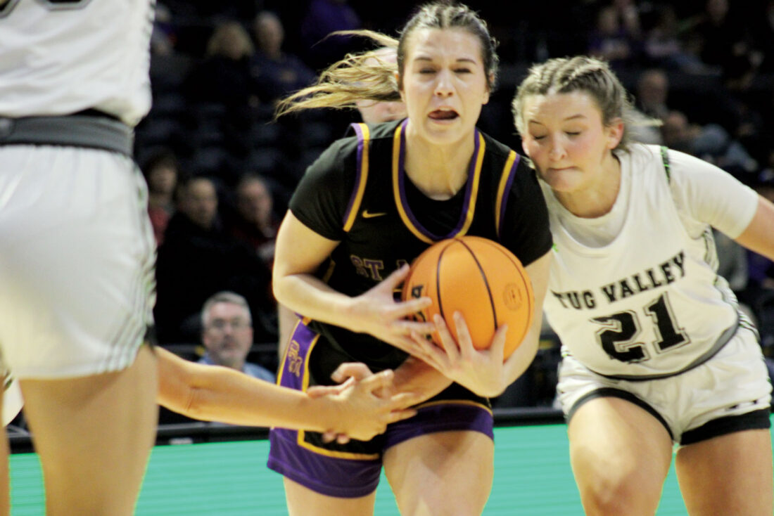 - St. Marys’ Anna Bennett, right, stands firm while defending Tug Valley’s Bailee Hall during Thursday’s Class A semifinal in Charleston. (Photo by Kerry Patrick)