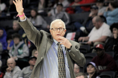 St. Marys girls basketball coach Fred King signals in a play during Thursday’s Class A semifinal against Tug Valley in Charleston. (Photo by Kerry Patrick)