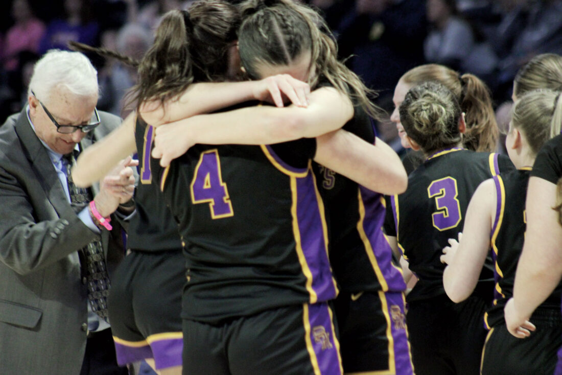 St. Marys’ Rylee Renner (4) gives teammate Laney Watkins a hug after the Blue Devils defeated Tug Valley 52-50 in a Class A semifinal, Thursday in Charleston. (Photo by Kerry Patrick)