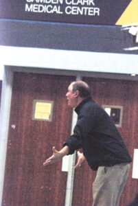 - Magnolia head coach Dave Tallman, who was trying to get his team to the state tournament for a second straight season, voices his displeasure following a call during the Blue Eagles’ 47-32 Class A, Region I, co-final setback Wednesday night to host Parkersburg Catholic. (Photo by Jay W. Bennett)