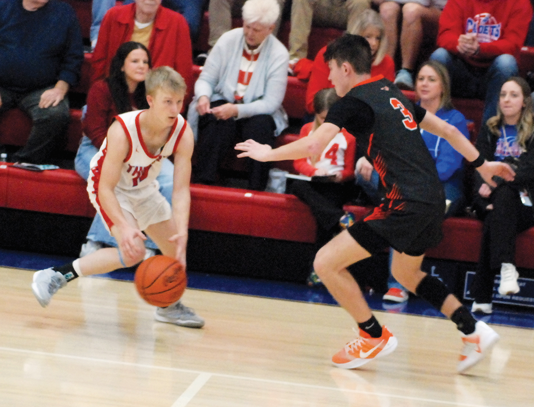 - Fort Frye’s Wyatt Duskey sets up the offense while being guarded by Meadowbrook’s Jake Burris during the Cadets’ 58-43 Division V East District quarterfinal victory Saturday night. (Photo by Jay W. Bennett)