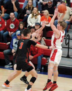 - Fort Frye’s Grady Hesson passes the ball before a halfcourt trap during the Cadets’ 58-43 Division V East District quarterfinal victory Saturday night versus Meadowbrook. (Photo by Jay W. Bennett)