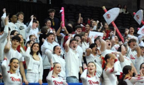 The Parkersburg student section celebrates during the Big Reds’ 56-51 win over Morgantown in the state semifinals Friday in Huntington. (Photo by Jay W. Bennett)