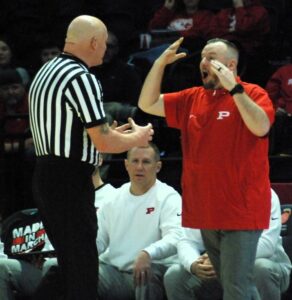 Parkersburg head coach Chris Murray has a question about a call during the Big Reds’ 56-51 win over Morgantown in the state semifinals Friday in Huntington. (Photo by Jay W. Bennett)