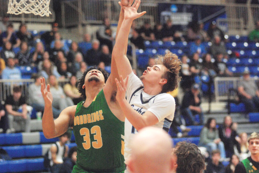 Parkersburg Catholic’s Luke Anderson, right, earned a spot on the Class A All-State first team after averging 13 points and 13 rebounds. (Photo by Jay W. Bennett)