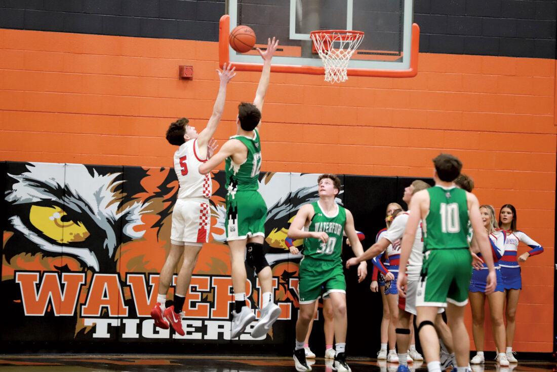 - Waterford’s Finn Pennock (left) puts up a shot against Peebles during Monday’s Division VI District Semifinal in Waverly. (Photo by Patricia Miller)