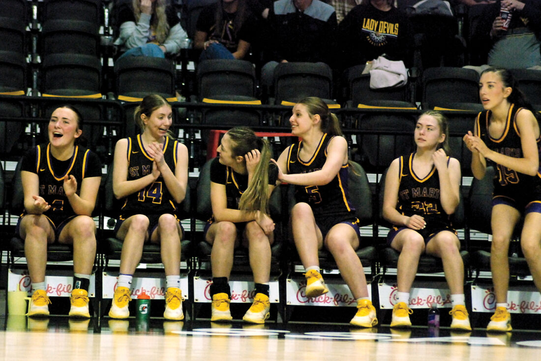 - The St. Marys bench reacts as time dwindles late in the fourth quarter during the Blue Devils’ 45-35 Class A state championship victory versus Gilmer County on Saturday morning inside the Charleston Coliseum. (Photo by Jay W. Bennett)