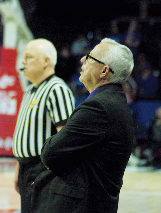 - St. Marys head coach Fred King takes a breath prior to the final seconds of the Blue Devils’ 45-35 Class A state championship victory versus Gilmer County on Saturday morning inside the Charleston Coliseum. (Photo by Jay W. Bennett)