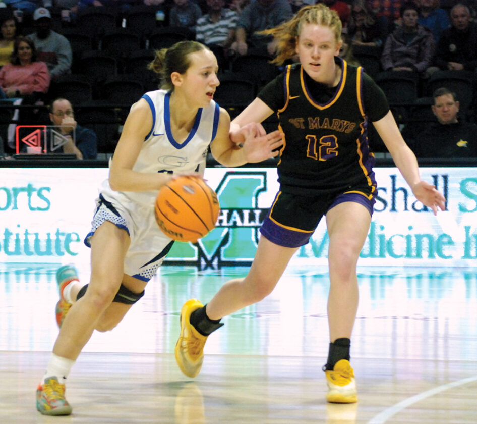 - Gilmer County’s Lena Frymier is guarded by St. Marys’ Lauren Pritchett during the Blue Devils’ 45-35 Class A state championship game victory Saturday morning inside the Charleston Coliseum. (Photo by Jay W. Bennett)