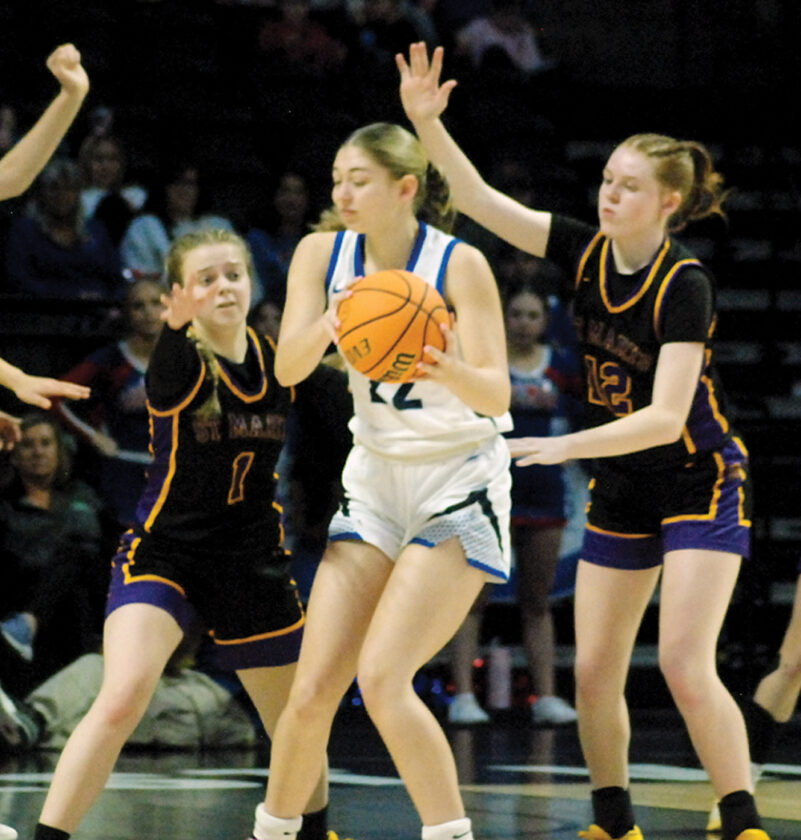- Gilmer County’s Kenley Hartshorn gets a double team from St. Marys’ Landrey Riggs and Lauren Pritchett during the Blue Devils’ 45-35 Class A state championship victory Saturday morning inside the Charleston Coliseum. (Photo by Jay W. Bennett)