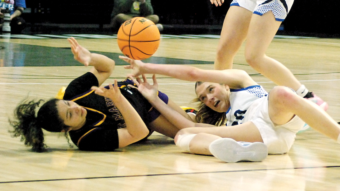 Brynnley Bulluck of St. Marys and Gilmer County's Ava Dobbins go after a loose ball during the Blue Devils' 45-35 Class A state championship victory Saturday morning inside the Charleston Coliseum. (Photo by Jay W. Bennett)