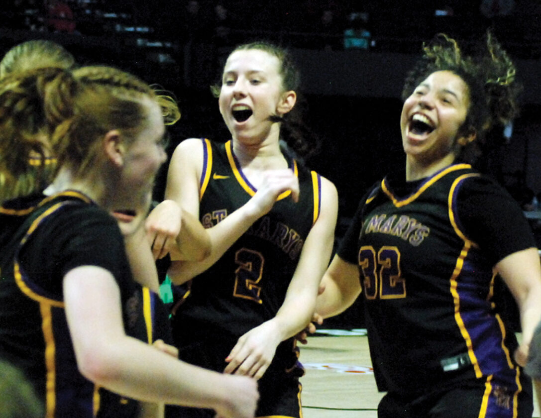 - St. Marys’ Lauren Pritchett, left, celebrates with teammates Anna Bennett (2) and Brynnley Bulluck (32) following the Blue Devils’ 45-35 Class A state championship victory versus Gilmer County on Saturday morning inside the Charleston Coliseum. (Photo by Jay W. Bennett)