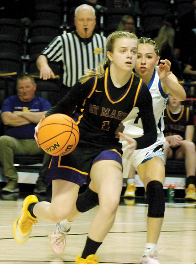 St. Marys' Landrey Riggs runs the weave while being guarded by Gilmer County's Paige Sterns during the Blue Devils' 45-35 Class A state championship victory Saturday morning inside the Charleston Coliseum. (Photo by Jay W. Bennett)