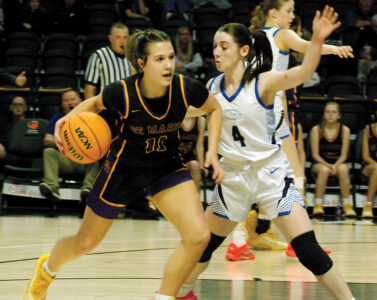 - St. Marys’ Landrey Riggs runs the weave while being guarded by Gilmer County’s Paige Sterns during the Blue Devils’ 45-35 Class A state championship victory Saturday morning inside the Charleston Coliseum. (Photo by Jay W. Bennett)
