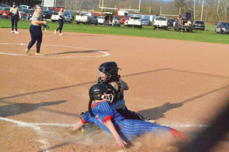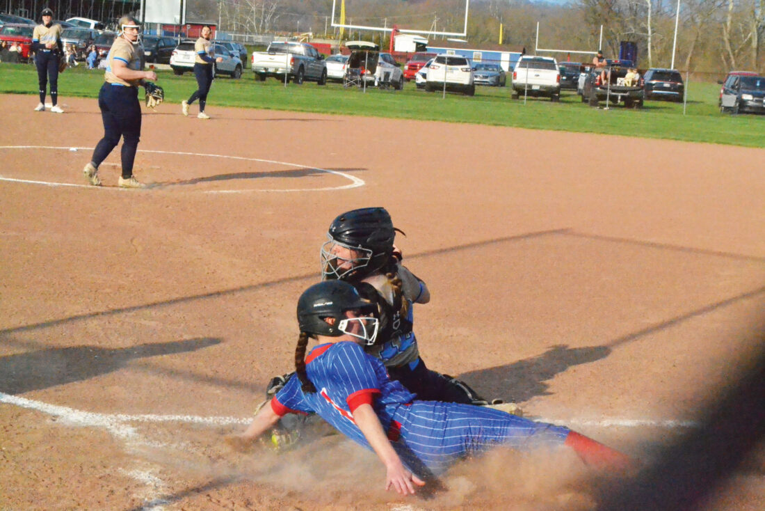 - Fort Frye’s Lexi Handshumacher is tagged out at the plate by Frontier catcher Braylee Buck Monday night at Fort Frye High School. The Cadets won the game 7-3. (Photo by Mike Morrison)