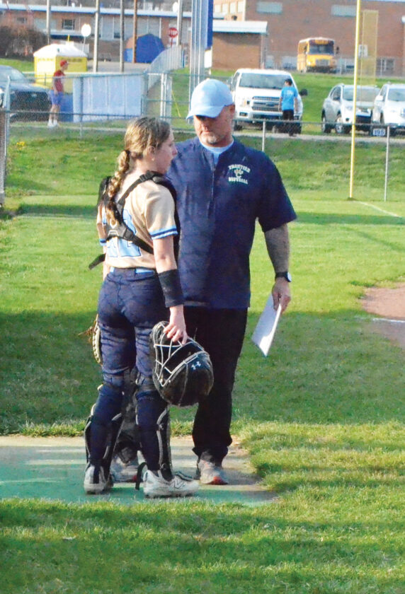 - Frontier assistant coach Daniel Hedrick’s visits with catcher Braylee Buck in between innings Monday night at Fort Frye High School. The Cadets came away with a 7-3 win. (Photo by Mike Morrison)