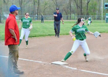 - Waterford third baseman MacKaylee Martin steps on third for the force out Friday evening in the Wildcats 10-3 loss to Fort Frye. (Photo by Mike Morrison)