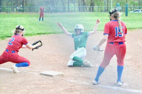 - Waterford’s MacKaylee Martin (7) slides safely into third base with a triple ahead of the tag of Fort Frye third baseman Jaden Cox (2) Friday night at Waterford Elementary School. (Photo by Mike Morrison)
