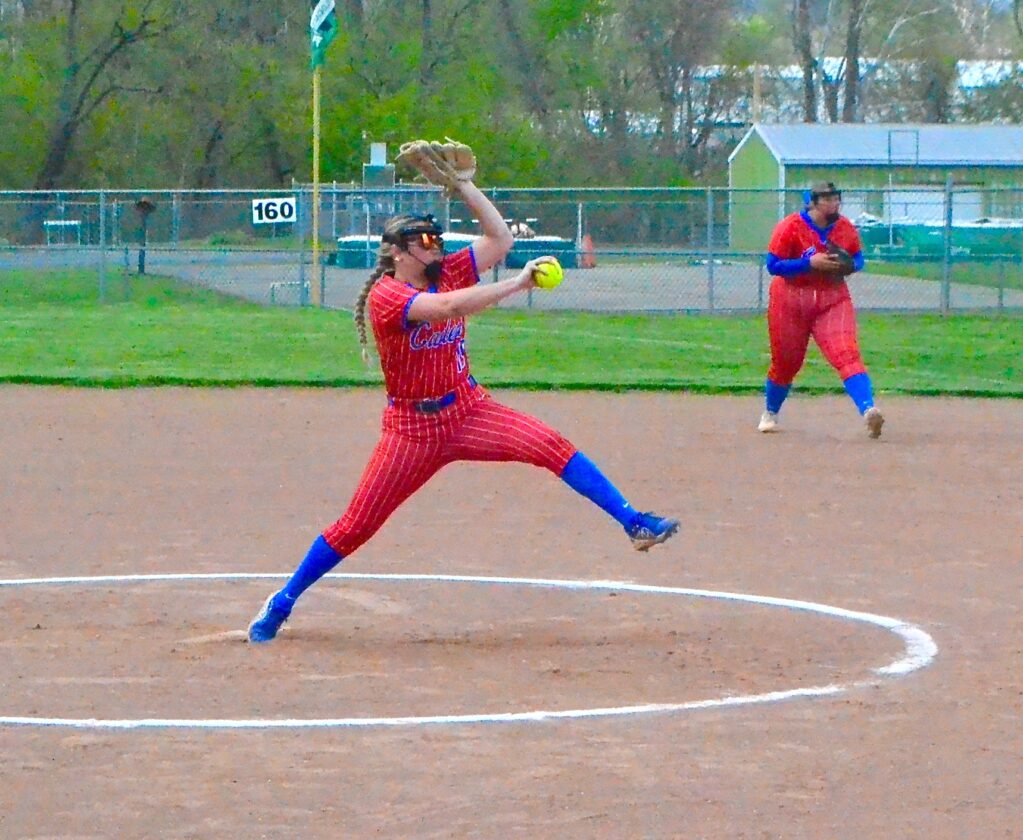 - Fort Frye’s Elle Casto delivers a pitch Friday night against the Fort Frye Cadets. Casto tossed a complete game to pick up the win as the Cadets rolled to a 10-3 win. (Photo by Mike Morrison)