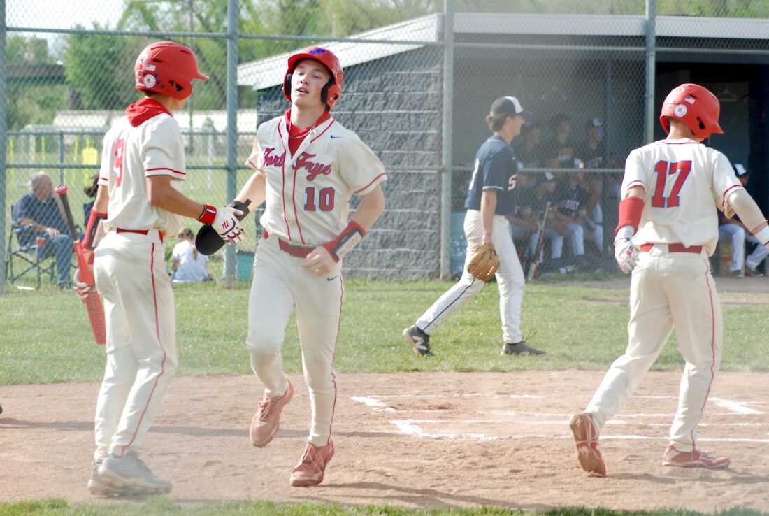 - Fort Frye’s Grady Hesson (10) is congratulated by teammate Wade Duskey during Wednesday’s 8-4 win versus Parkersburg South at Hank Greenburg Field. (Photo by Jay W. Bennett)
