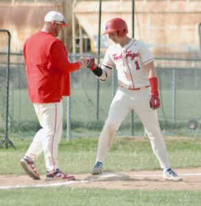 Fort Frye's Kainan Bradford gets congratulations from head coach Trey Engle after his two-run triple in the first inning of the Cadets' 8-4 win Wednesday versus Parkersburg South at Hank Greenburg Field. (Photo by Jay W. Bennett)