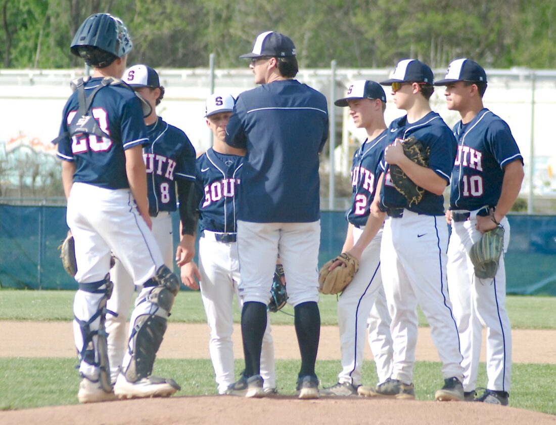 - Parkersburg South acting head coach Nate Currey has a meeting on the mound during Wednesday’s 8-4 setback to Fort Frye at Hank Greenburg Field. (Photo by Jay W. Bennett)