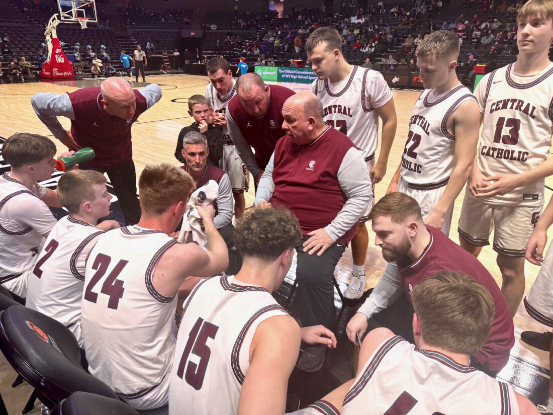 Wheeling Central Catholic coach Mel Stephens, center, addresses his Maroon Knights squad during a timeout at a Class AA Boys Basketball State Tournament game at the Charleston Coliseum in March. (Photo by Jim Workman for the West Virginia Sports Writers Association)