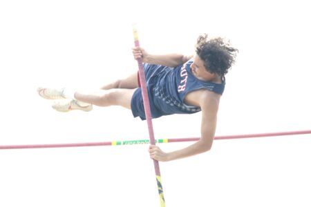- Parkersburg South’s Shawn Thornhill clears the bar during the boys pole vault competition during Tuesday’s Fenton Relays at Williamstown High School. (Photo by Kerry Patrick)