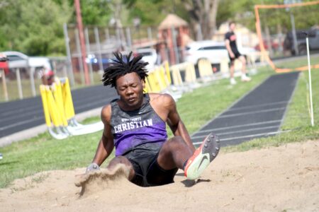 - Wood County Christian’s Angelus Palata lands in the long jump pit during Tuesday’s Fenton Relays at Williamstown High School. (Photo by Kerry Patrick)