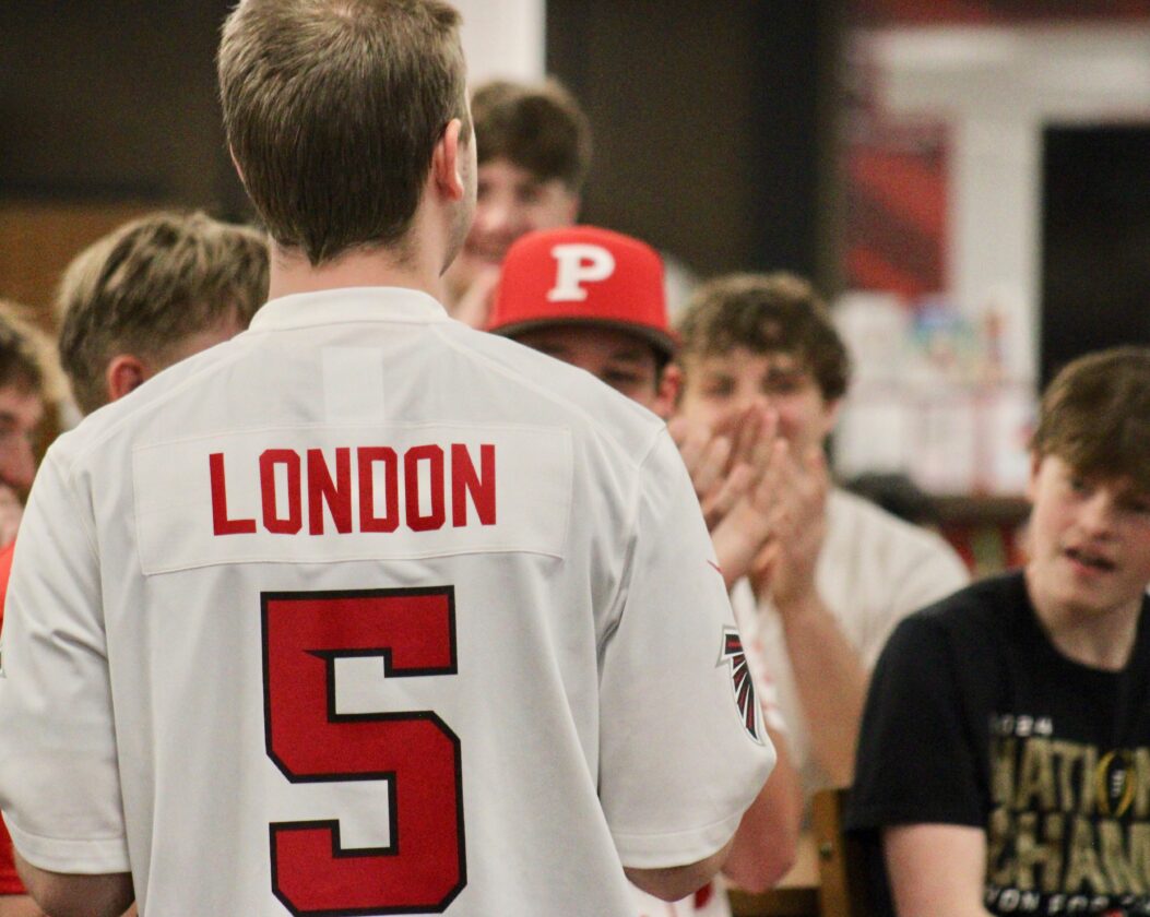 A gift package was delivered to Sam Vincent, who teaches the class at PHS and he presented it to Smith on Tuesday. Among the items included were a Drake London No. 5 jersey and the official invitation to the NFL draft.
