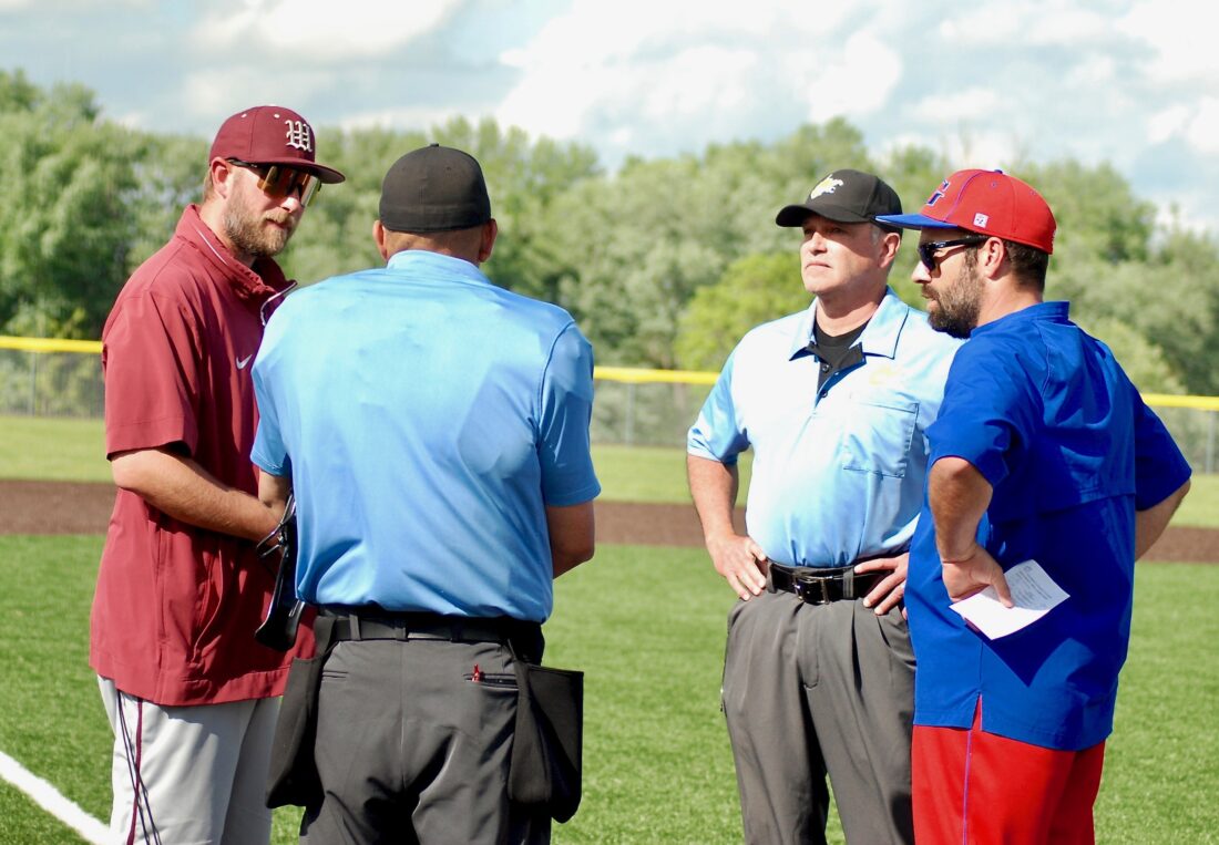 Williamstown head coach Levi Maxwell, left, and Gilmer County skipper Jacob Wolfe meet with the umpires prior to Tuesday night's Little Kanawha Conference semifinal game at Bill Coiner Field. (Photo by Jay W. Bennett)