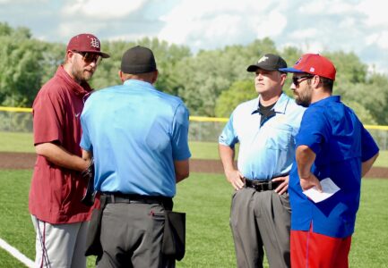 - Williamstown head coach Levi Maxwell, left, and Gilmer County skipper Jacob Wolfe meet with the umpires prior to Tuesday night’s Little Kanawha Conference semifinal game at Bill Coiner Field. (Photo by Jay W. Bennett)