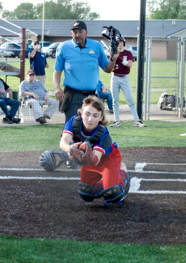 - Gilmer County catcher Dallas Goodrich makes a diving catch on a foul bunt pop up by Williamstown’s Daniel Cunningham during the Titans’ 3-2 Little Kanawha Conference semifinal setback on Tuesday at Bill Coiner Field. (Photo by Jay W. Bennett)
