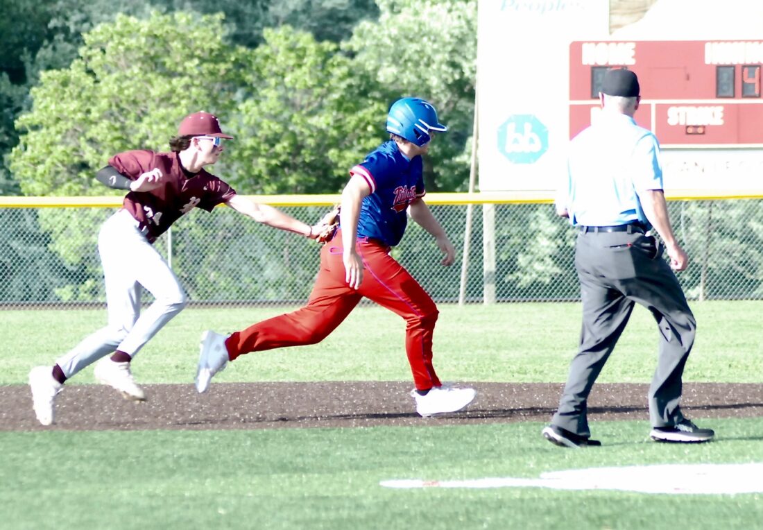 - Williamstown third baseman Ben Raines tags out Gilmer County’s Roddick Page during the Yellowjackets’ 3-2 Little Kanawha Conference semifinal victory on Tuesday at Bill Coiner Field. (Photo by Jay W. Bennett)