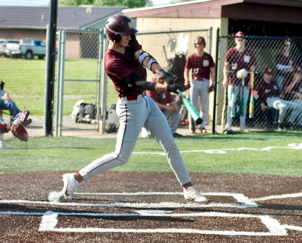 - Williamstown’s Tyler Keiser strokes an opposite-field double during the third inning of the Yellowjackets’ 3-2 Little Kanawha Conference semifinal victory versus Gilmer County on Tuesday at Bill Coiner Field. (Photo by Jay W. Bennett)