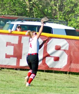 - Parkersburg center fielder Danica Coffman makes a catch during the Big Reds’ 12-8 setback to St. Albans on Friday evening at Larry Allen Field. (Photo by Jay W. Bennett)