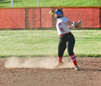 - Parkersburg shortstop Brynn Frye makes a throw to first during the Big Reds’ 12-8 setback to St. Albans on Friday evening at Larry Allen Field. (Photo by Jay W. Bennett)