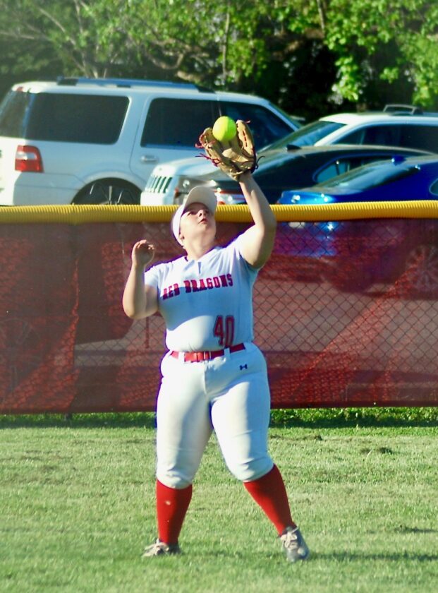 - St. Albans left fielder Aydrien Toney grabs a fly ball off the bat of Parkersburg’s Krista Durkin during the Red Dragons’ 12-8 win Friday evening at Larry Allen Field. (Photo by Jay W. Bennett)