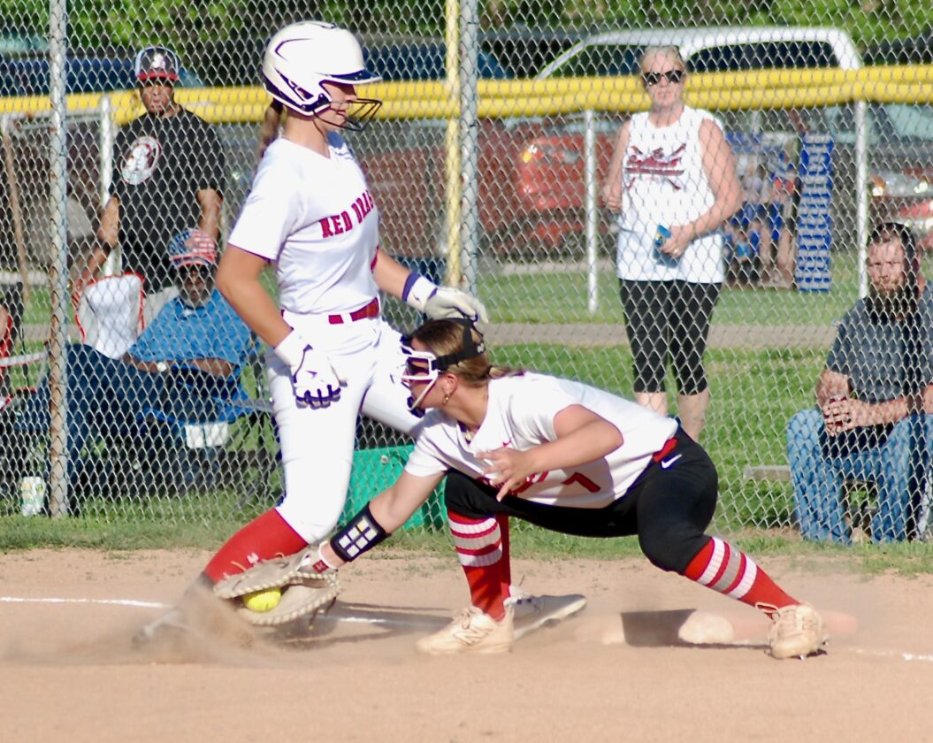 St. Albans' Paige White just gets back to the bag in time as Parkersburg's Krista Durkin applies the tag during the Red Dragons' 12-8 win Friday evening at Larry Allen Field. (Photo by Jay W. Bennett)